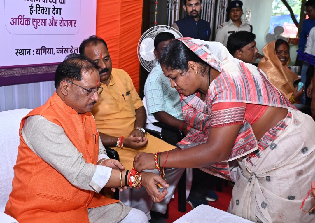 रायपुर 09 अगस्त 2025/मुख्यमंत्री विष्णु देव साय के गृह ग्राम बगिया स्थित कैंप कार्यालय में रक्षाबंधन के अवसर पर विभिन्न योजनाओं से लाभान्वित बहनों ने राखी बांधकर आभार व्यक्त किया। प्रधानमंत्री आवास योजना, महतारी वंदन योजना की हितग्राही दीदियों के साथ आंगनबाड़ी कार्यकर्ता-सहायिकाएँ, मितानिन और स्व-सहायता समूह की बहनों ने भी मुख्यमंत्री श्री साय की कलाई पर राखी बांधी और उनके दीर्घायु की कामना की।
