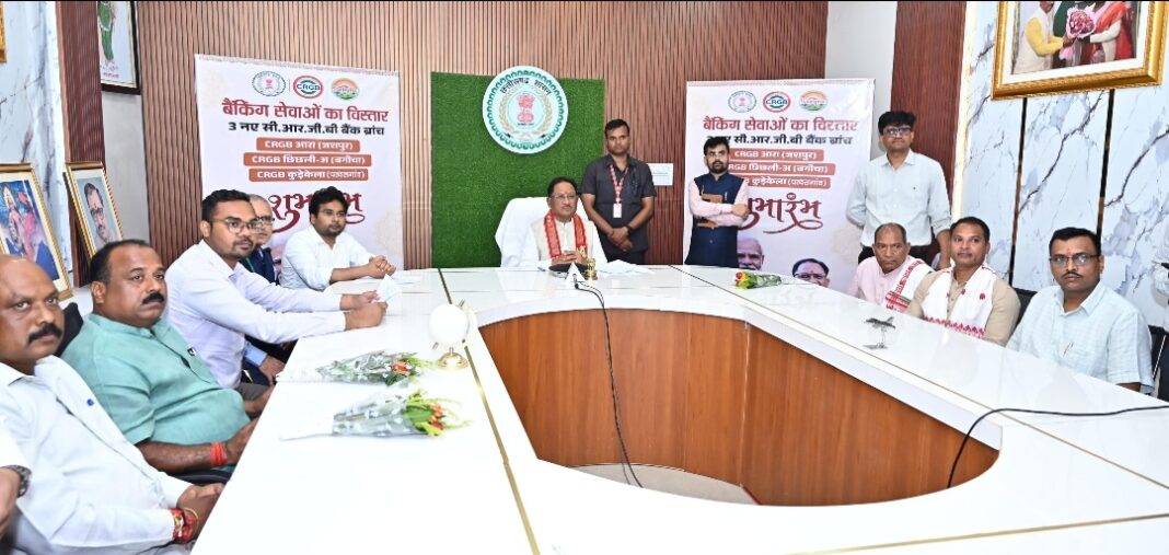 मुख्यमंत्री श्री साय ने जशपुर जिले के बगिया ग्राम में मुख्यमंत्री कैंप कार्यालय से वर्चुअल माध्यम से जशपुर विकासखंड के ग्राम आरा, पत्थलगांव विकासखंड के ग्राम कुडे़केला (घरजियाबथान) और बगीचा विकासखंड के ग्राम छिछली में छत्तीसगढ़ राज्य ग्रामीण बैंक की नई शाखाओं का लोकार्पण किया। इस अवसर पर उन्होंने छत्तीसगढ़ राज्य ग्रामीण बैंक के 12वें वार्षिक प्रतिवेदन का भी विमोचन किया।