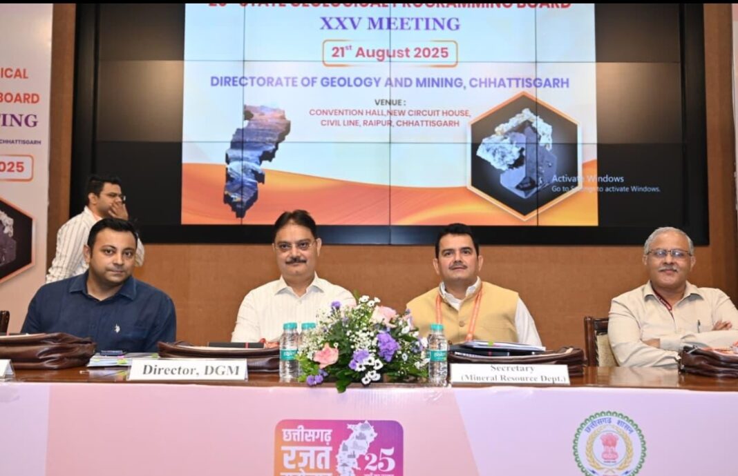 रायपुर, 21 अगस्त 2025। राज्य स्तरीय भू-वैज्ञानिक कार्यक्रम मंडल छत्तीसगढ़ की रजत महोत्सव के रूप में 25वी बैठक आज सिविल लाईन स्थित न्यू सर्किट हाऊस में श्री पी. दयानंद, सचिव, छत्तीसगढ़ शासन, खनिज साधन विभाग एवं अध्यक्ष छत्तीसगढ़ भू-वैज्ञानिक कार्यक्रम मंडल की अध्यक्षता में सम्पन्न हुई। बैठक में श्री रजत बंसल, संचालक भौमिकी तथा खनिकर्म एवं केन्द्र सरकार तथा राज्य शासन के विभिन्न विभागो, उपक्रमों के प्रतिनिधि भी उपस्थित रहे। बैठक का मुख्य उद्देश्य प्रदेश में खनिज संसाधनों के बेहतर उपयोग, नए खनन परियोजनाओं की रूपरेखा तैयार करना और गत वर्ष की उपलब्धियों की समीक्षा करना रहा।