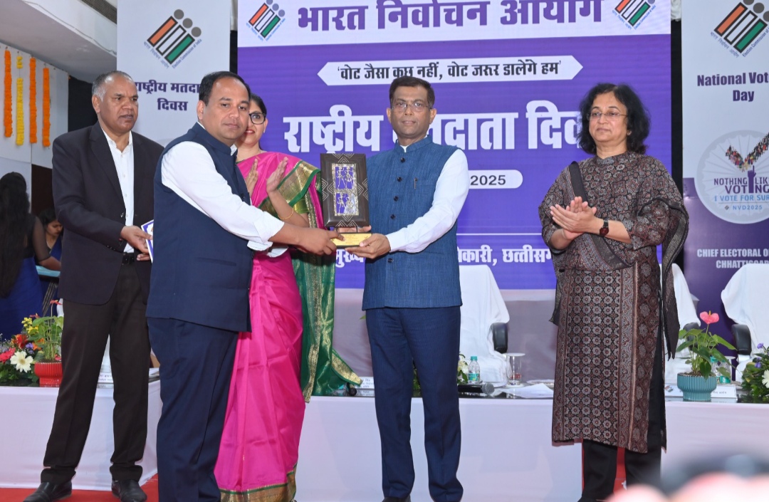 मतदाता दिवस के अवसर पर उपस्थित सभी लोगों को मतदाता शपथ दिलाई गई। कार्यक्रम में नव मतदाताओं, सर्विस वोटरों और निर्वाचन कार्यों में उल्लेखनीय योगदान देने वाले अधिकारियों-कर्मचारियों को सम्मानित किया गया। रायगढ़ कलेक्टर श्री कार्तिकेय गोयल को प्रदेश में लोकसभा निर्वाचन 2024 में सर्वाधिक 81.66 प्रतिशत मतदान कराए जाने, दुर्ग कलेक्टर सुश्री ऋचा प्रकाश चौधरी को शहरी क्षेत्र होने के बावजूद विगत लोकसभा चुनाव की तुलना में वर्ष 2024 में लोकसभा निर्वाचन में मतदान प्रतिशत में 2.48 प्रतिशत वृद्धि, दंतेवाड़ा कलेक्टर श्री मयंक चतुर्वेदी को धुर नक्सल प्रभावित क्षेत्र होते हुए भी विगत लोकसभा निर्वाचन की तुलना में लोकसभा निर्वाचन 2024 में 10.39 प्रतिशत वृद्धि के लिए उत्कृष्ट जिला निर्वाचन अधिकारी के रूप में सम्मानित किया गया। रायपुर कलेक्टर श्री गौरव कुमार सिंह को लोकसभा निर्वाचन 2024 के दौरान मतदान दलों का प्रशिक्षण कार्य उत्कृष्ट तरीके से संपन्न कराने, राजनांदगांव जिला पंचायत की मुख्य कार्यपालन अधिकारी सुश्री सुरुचि सिंह को गुणवत्ता पूर्ण स्वीप गतिविधियां आयोजित करने और मुंगेली जिले के जिला पंचायत मुख्य कार्यपालन अधिकारी श्री प्रभाकर पांडे को प्रवासी मजदूरों को मतदान के लिए प्रेरित करने संबंधी स्वीप गतिविधियों के लिए स्पेशल अवार्ड से सम्मानित किया गया।
