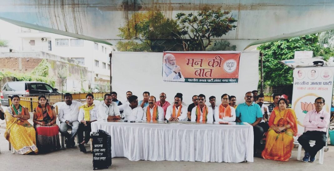 रायपुर। प्रधानमंत्री नरेंद्र मोदी के मन की बात के 113 वे संस्करण को आज मंडल अंतर्गत बूथ क्रमांक 104 मे शंकर नगर अंडर ब्रिज मे सुना गया । इस अवसर पर भाजपा प्रदेश के मंत्री किशोर महानन्द प्रदेश प्रवक्ता नालंनीश ठोकने, जोन अध्यक्ष प्रमोद साहू मंडल अध्यक्ष अनूप खेलकर पूर्व अध्यक्ष एवं मन की बात के मंडल प्रभारी विपिन पटेल पूर्व मंडल अध्यक्ष संजय कश्यप मंडल महामंत्री सुधीर चौबे, सुशील मंडल,मंडल उपाध्यक्ष एवं मन की बात के सह प्रभारी राधेश्याम बाघ, मंडल उपाध्यक्ष रामदास मानिकपुरी, हरिवंश वर्मा, राम प्रजापति, राजेश तंडी, गणेश निर्मलकर, मीना से गायत्री चंद्राकर अमित डोये मनोज दलवलकर, इन्दर नायक खेमा सागर, प्रभार मिश्रा, डुमेंद्र वर्मा, राकेश सिन्हा महेश बघेल, सानू तंडी, शम्भू लवंशी, बूथ अध्यक्ष वीरमानी चौबे , आशा साठे आदि कार्यकर्ता उपस्थित थे। इसके अलावा भी राजधनी में मोदी जी के मन की बात आमजनों ने भी सुनी।