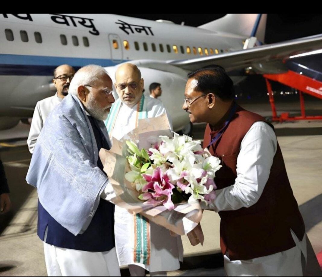 रायपुर । राजधानी रायपुर में आयोजित DGP-IG कॉन्फ्रेंस में शामिल होने प्रधानमंत्री नरेंद्र मोदी शुक्रवार की रात रायपुर पहुंच गए हैं। एयरपोर्ट पर गृह मंत्री अमित शाह और मुख्यमंत्री विष्णुदेव साय ने उनका आत्मीय स्वागत किया।