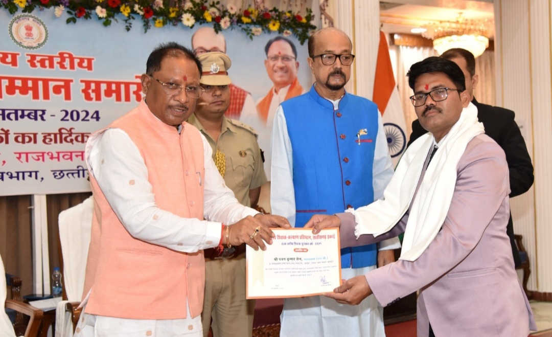 रायपुर, 05 सितंबर 2024/राज्यपाल रमेन डेका और मुख्यमंत्री श्री विष्णु देव साय ने आज शिक्षक दिवस के अवसर पर राजभवन गरिमामयी समारोह में वर्ष 2023-24 के उत्कृष्ट शिक्षकों को राज्य स्तरीय सम्मान प्रदान किया। राज्यपाल श्री डेका ने कहा शिक्षक विद्यार्थियों को बड़ा सपना देखने प्रेरित और पूरा करने प्रोत्साहित करें। उन्होंने कहा कि शिक्षक विद्यार्थियों को शिक्षा के साथ-साथ नैतिक मूल्यों की भी शिक्षा देना सुनिश्चित करें।